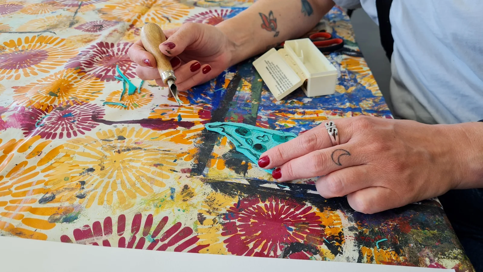 Linoldruck ist eine kreative Herausforderung: Die Teilnehmer:innen müssen sorgfältig vorgehen, da es anspruchsvoll ist, feine Formen in das Linoleum zu schneiden. Gleichzeitig ist viel Raum zum Ausprobieren – mit jeder Druckprobe sehen sie, wie sich Farbmenge und Druckkraft auf das Ergebnis auswirken, und können Schritt für Schritt dazulernen.